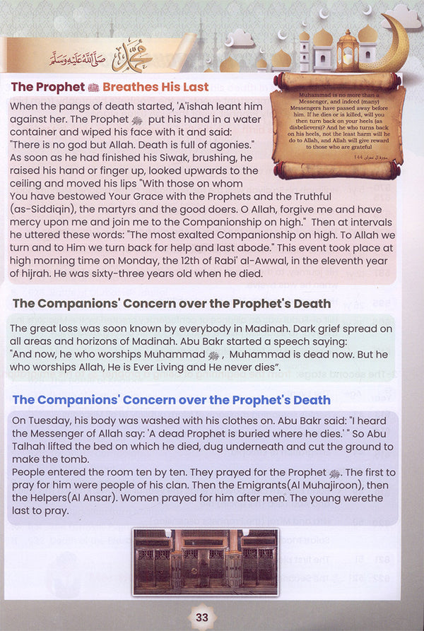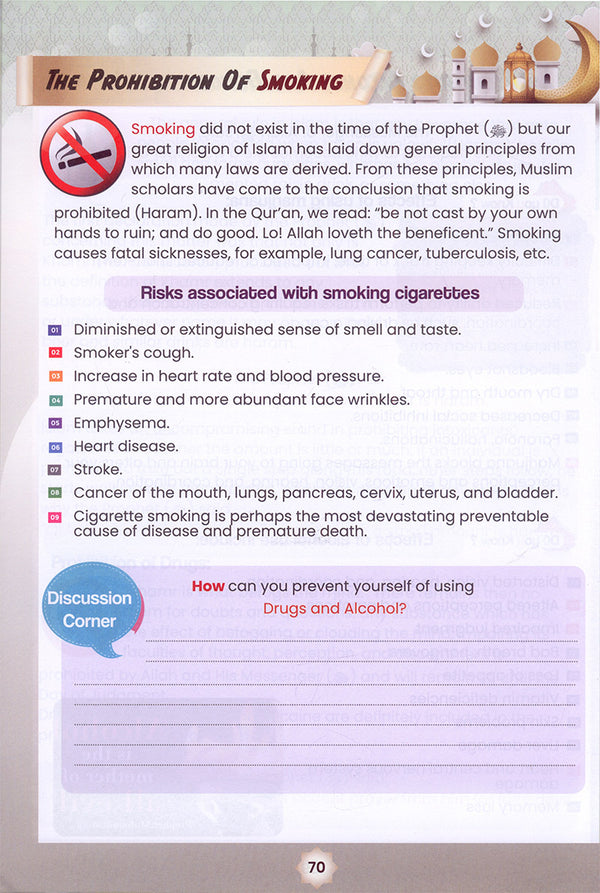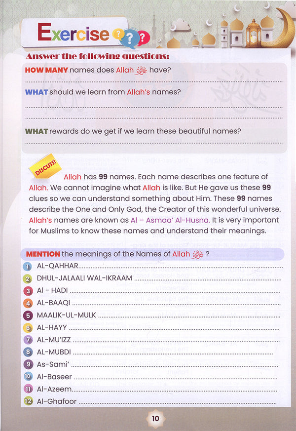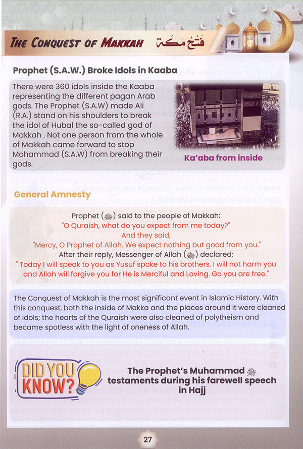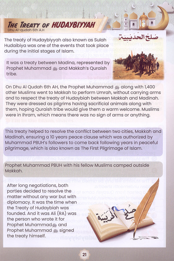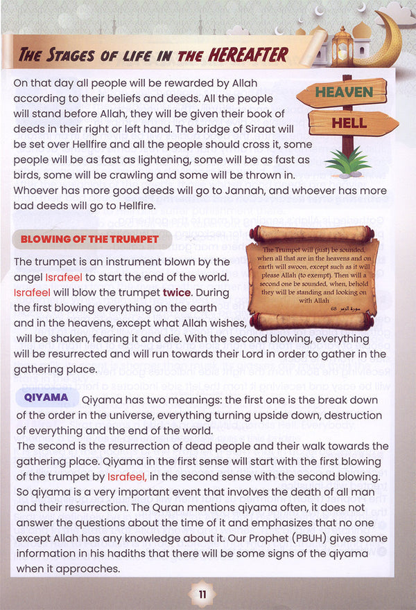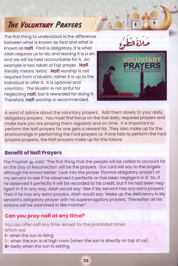 Most of the terms are presented in their original Arabic script along with a translation of their meanings. This also applies to supplications which have to be memorized in their Arabic version. Additionally, the colorful artwork used will certainly appeal to young students.