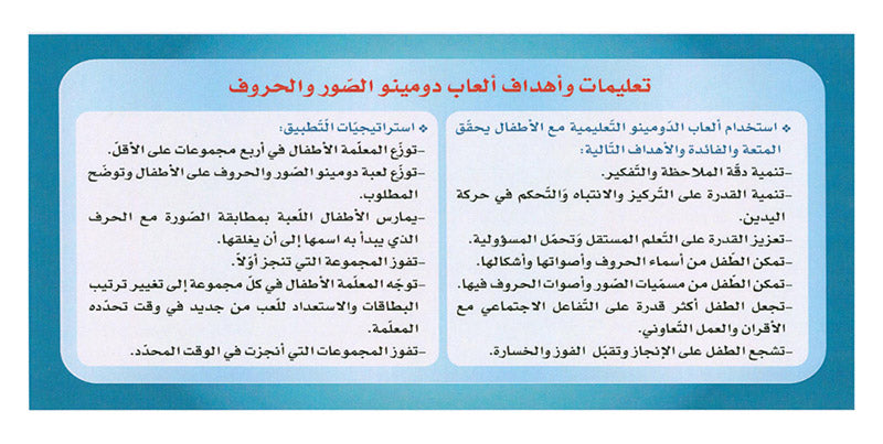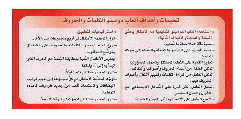 - مع مرور الوقت يزداد عدد البطاقات لدى كل طفل تباعاً ممّا يمكّنه من إجراء لعبتي المطابقة والأنماط بأكثر من حرف