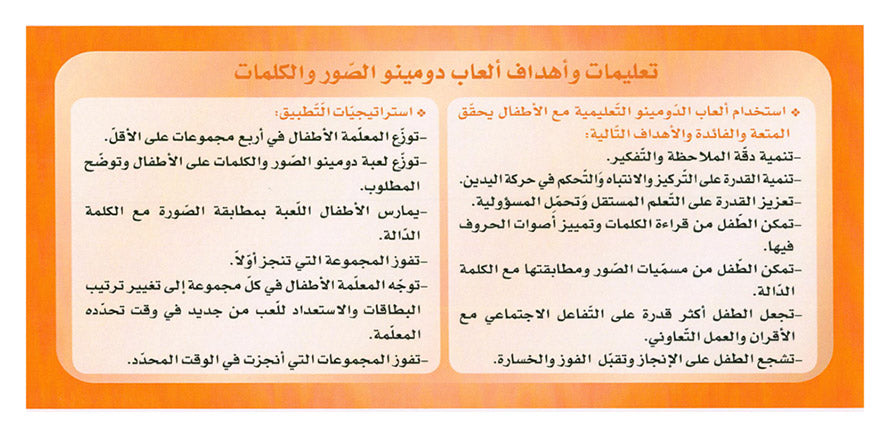 - توزّع بطاقات الكلمات والصّور المقصودة على الأطفال وتطلب منهم مطابقة الصّورة مع الكلمة الدّالة.