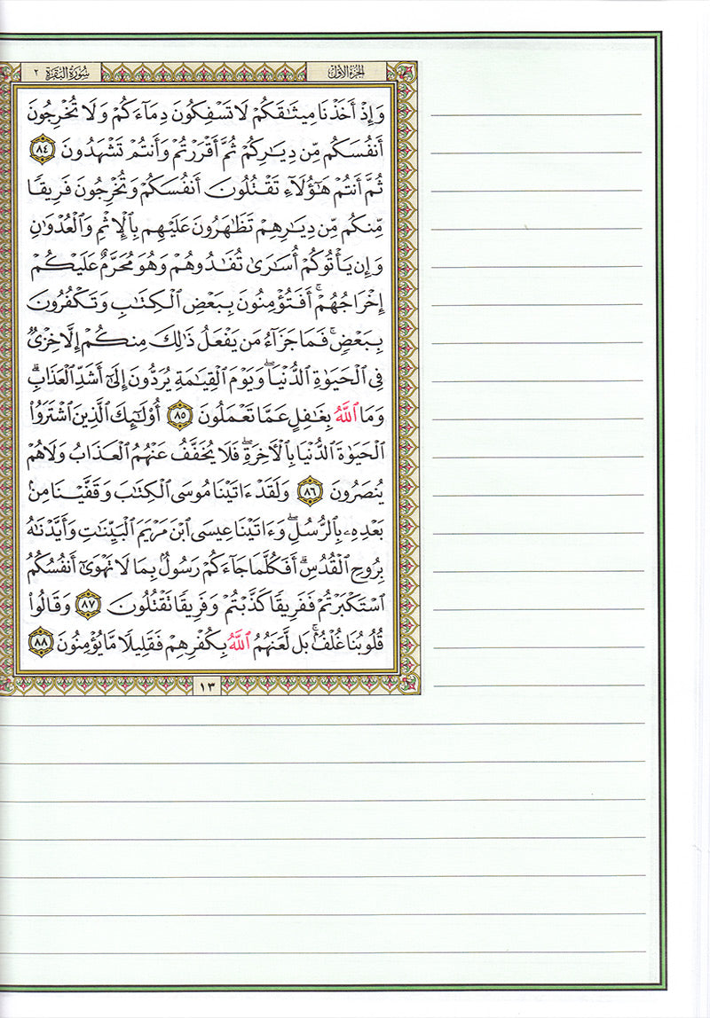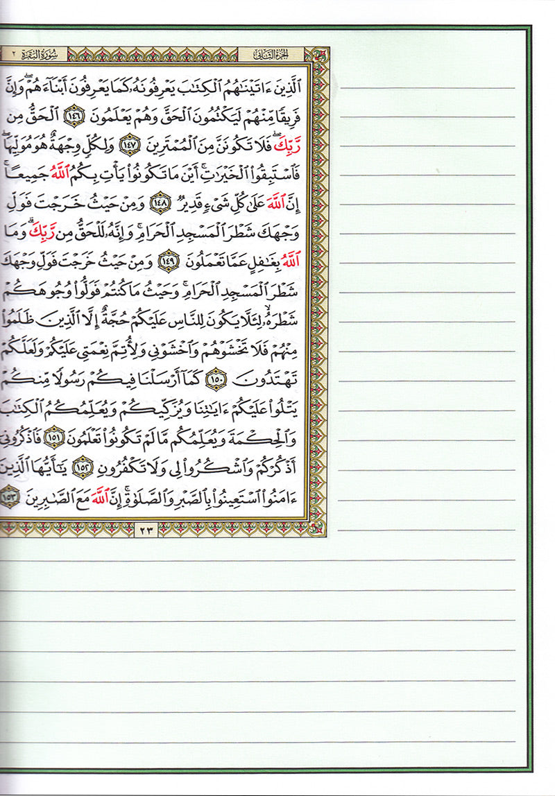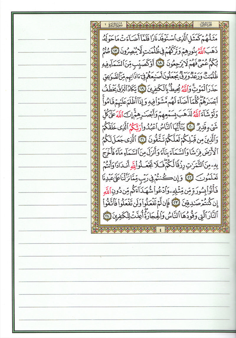 The Tadween Mushaf, also known as a "Margin Quran," features wide, ruled margins surrounding the text of the Quran. These margins provide ample space for writing notes, interpretations, and reflections, making it an invaluable tool for students, scholars, and anyone seeking to deepen their understanding and memorization of the Quran.